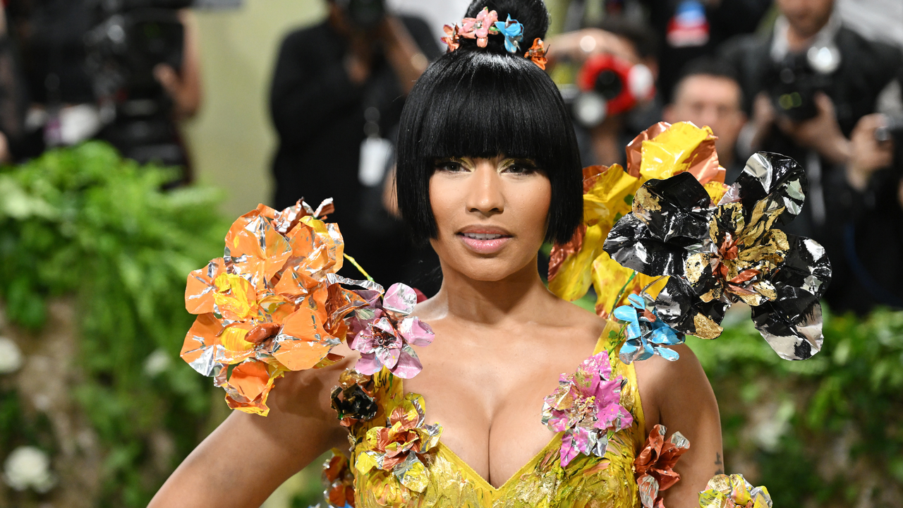 Nicki Minaj made an appearance on the red carpet in a chic yellow and metallic minidress by Marni. Throughout the design, there were miniature flowers with crystals embedded into them which point to Minaj leaning into the night’s theme. The florals which lean into reimagining garments inspired by the natural world appeared in assorted hues including orange, lilac, a bright teal, a bold magenta, and even a punchy orange color. A pair of matching yellow pumps and clutch were the ideal match for this girly and ethereal look.