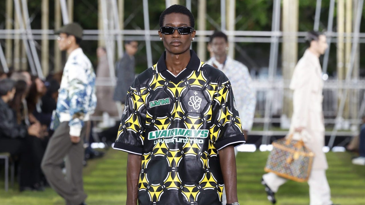 “It went from black to dark brown to brown to light brown to beige, a little bit of gray … and then finally to white,” Pharrell said of his Spring show, where models walked a lawn evoking LV’s Damier check beneath a fleet of nearly two-hundred international flags. The well-dressed, well-traveled sophisticate, the dandy, is the show’s central character, taking form in various patchworks of leather, suede, and emblemed tailoring. There is a sense of cultural plurality celebrated under an idealized understanding of diversity, almost literal in its presentation by way of venue and casting.