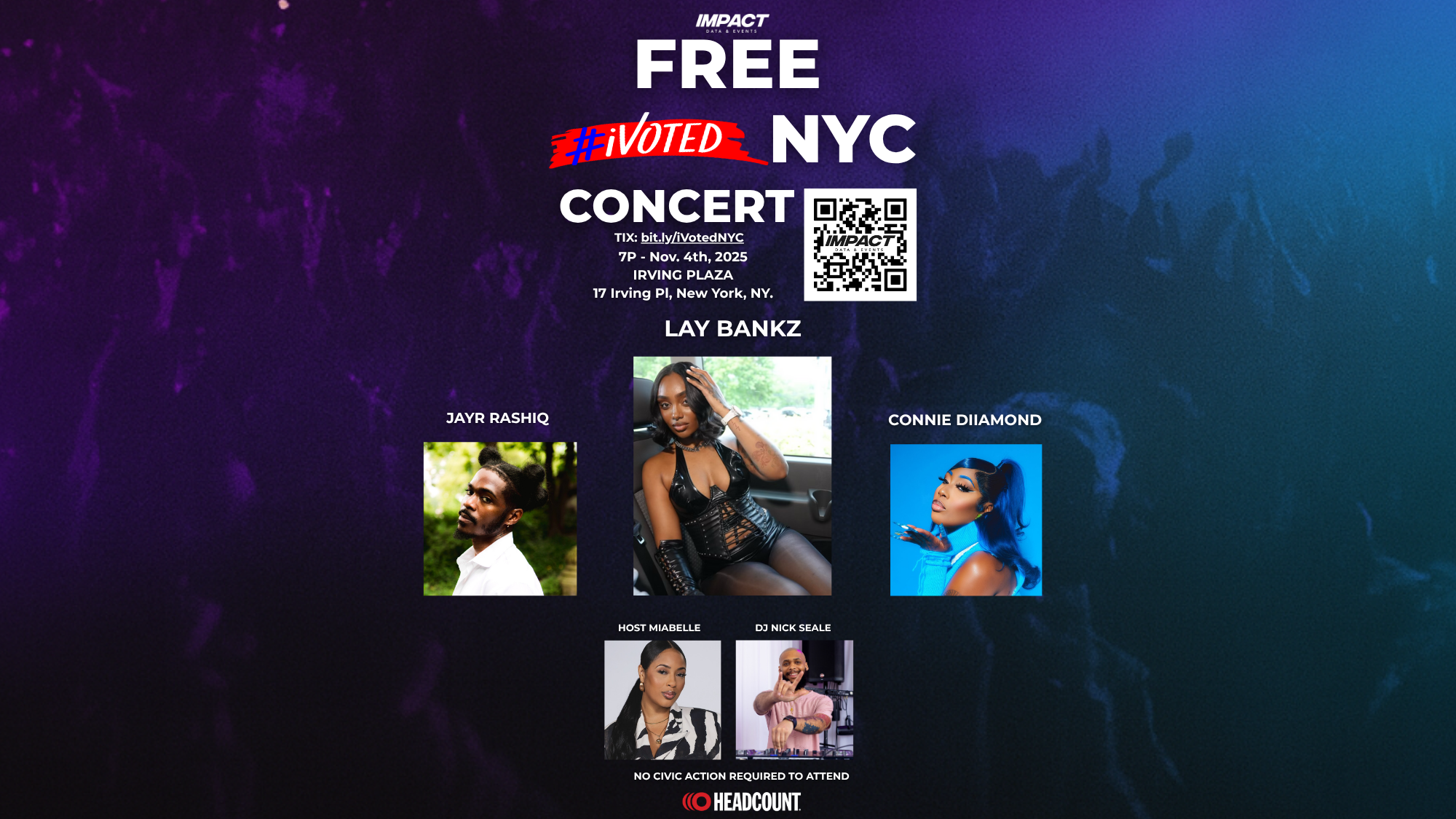 This all culminates in a November 4th #iVoted NYC Concert in the heart of Manhattan at Irving Plaza on election night featuring performances by Lay Bankz, Connie Diiamond, JayR Rashiq, DJ Nick Seale, with HOT 97’s Miabelle hosting, and more. RSVP HERE by checking your voter registration with HeadCount or by submitting a selfie from outside of your polling place / at home with a blank and unmarked ballot. Ineligible voters also have free options to RSVP to ensure all are welcome.