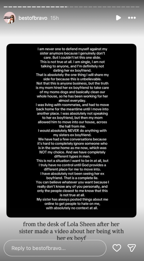 “I am never one to defend myself against my sister anymore because I genuinely don’t care. But I couldn’t let this one slide,” wrote Lola, via @bestofbravo on Instagram. “This is not true at all. I am single, I am not talking to anyone, and I’m definitely not dating her ex boyfriend. That is absolutely the one thing I will share my side for because this is unbelievable.”