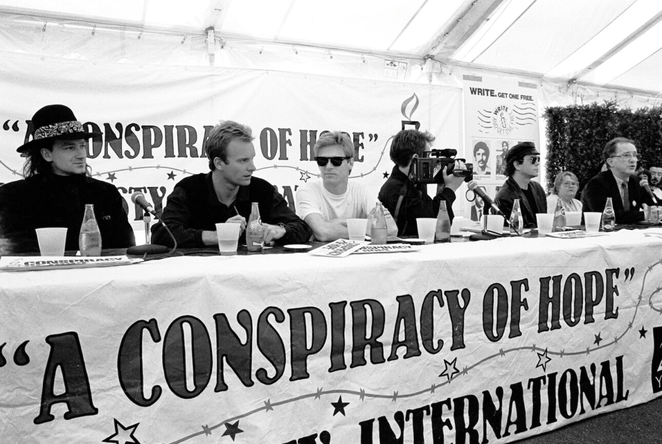From left: Bono, Sting, Bryan Adams, Peter Gabriel (holding a video recorder), Lou Reed, and Amnesty International USA’s Executive Director Jack Healey during a press conference for Amnesty International’s ‘A Conspiracy of Hope’ concert, East Rutherford, New Jersey, June 14, 1986. They were promoting the final concert of a six-date benefit tour which took place the following day. (Credit: Gary Gershoff/Getty Images)