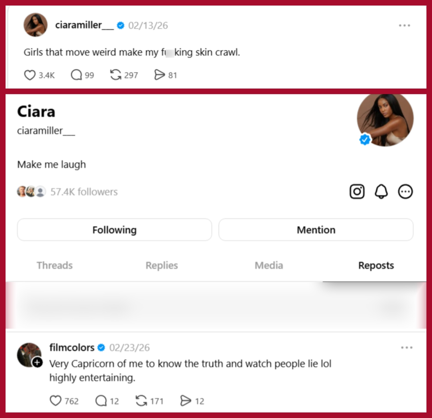Meanwhile, amid reports of Ciara distancing herself from Amanda, her old posts are now resurfacing including a post from Threads made last month on February 13.