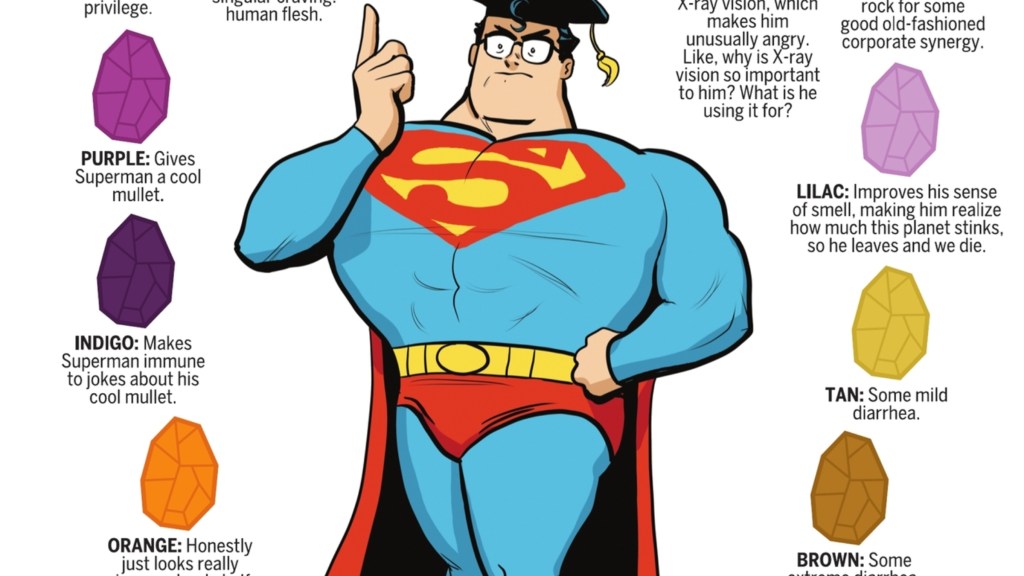 As the mind behind MAD About DC #1, Chip Zdarsky couldn’t just sit on the sidelines, so one of his contributions to the special is “Know Your Kryponite”. This section is presented as a definitive guide to every kryptonite variant. But in true Zdarsky fashion, this section takes the piss out of the irradiated rocks’ different impacts on Superman by coming up with incredibly specific and just plain silly effects. From white kryptonite giving Superman incredible privilege to various brown kryptonites giving him diarrhea, one has to wonder how in the hell Zdarsky managed to come up with these ideas.